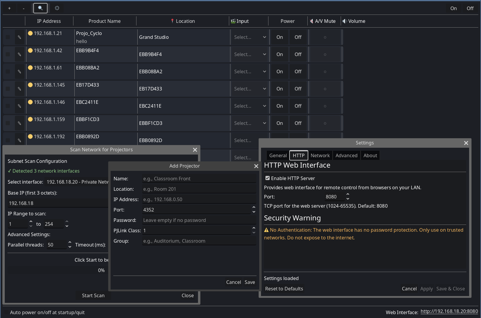 - Controls PJLink-compatible projectors from a desktop app and embedded web UI